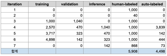 2. 수작업보다 적은 작업량 – SageMaker Ground Truth에 내재된 자동화 라벨링(Automated labeling)을 이용하면 초기 단계에서 수작업으로 분류된 이미지로 분류 모델을 만들고, 그 모델이 나머지 이미지를 자동으로 분류하게 됩니다. 단계별 자세한 내용은 SageMaker Ground Truth 개발자 문서를 참고하시기 바랍니다. 이 과정을 통해서 수작업으로 분류해야 하는 이미지를 43% 감소시키는 효과가 있었습니다. 다음은 직접 SageMaker Ground Truth를 이용하면서 얻은 이터레이션(iteration)별 이미지 수 입니다. (training, validation은 이전 이터레이션까지의 누적 값이며, 그 외 지표는 각 이터레이션 별 값입니다.)