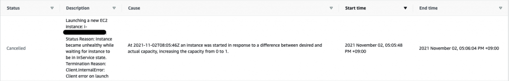 위에서 AMI가 공유되었으므로 일반적인 방법과 동일하게 시작 템플릿(Launch template)이나 시작 구성(Launch Configuration)을 생성한 후, 오토 스케일링 그룹을 생성하고 desired capacity를 적용해서 EC2가 기동 되는 액티비티를 확인하면 아래와 같은 오류가 발생합니다.