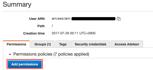 정책이 생성되었으므로 이를 원하는 IAM 사용자에게 연결합니다. IAM 메뉴에서 사용자를 선택한 후 권한 추가(Add permissions)를 수행합니다.