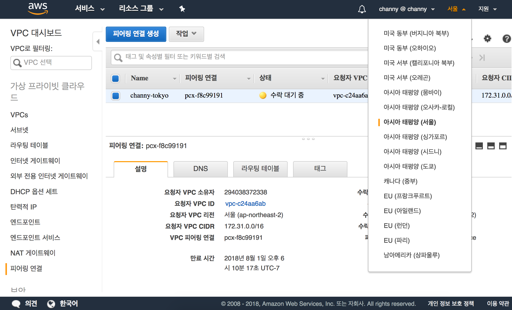 이제 서울 리전을 비롯하여 모든 상용 리전(중국 제외)에서 VPC 피어링을 활용할 수 있습니다. 리전 간 VPC 피어링 연결을 통해 전송되는 데이터에는 표준 리전 간 데이터 전송 요금이 부과됩니다. 자세한 내용은 리전 간 VPC 피어링에 대한 블로그를 읽거나 VPC 피어링에 대한 설명서 페이지를 참조하십시오.
