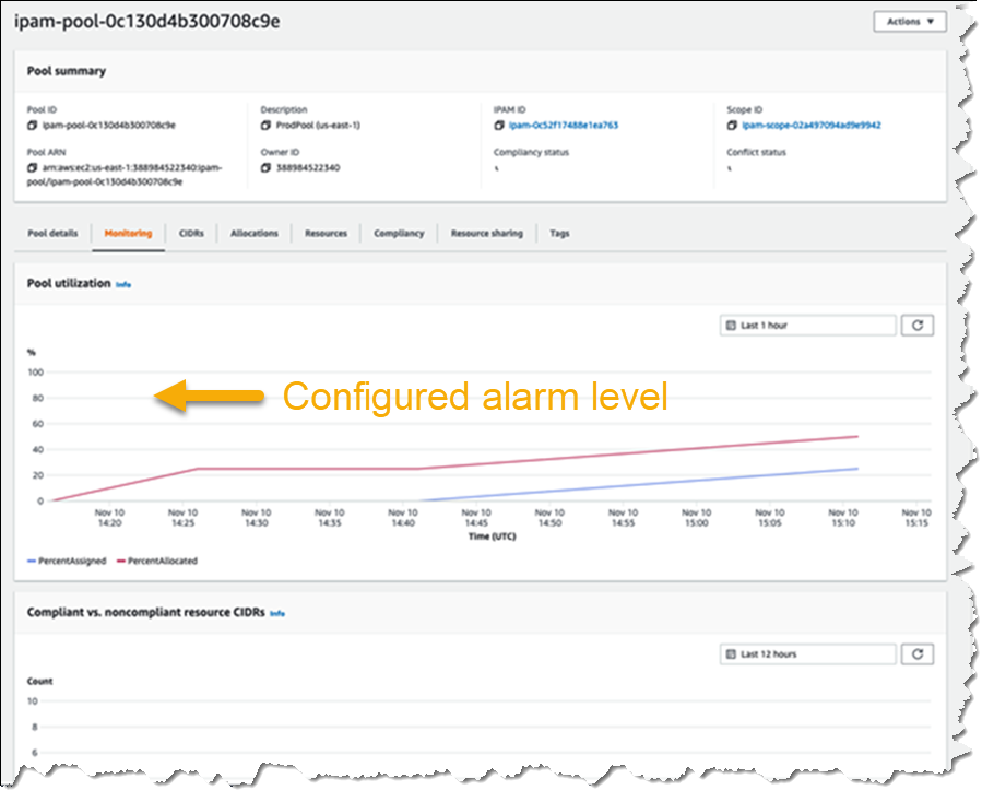 아래 스크린샷에서는 VPC 집합 전체에서 풀 사용률을 모니터링하는 방법을 보여줍니다.