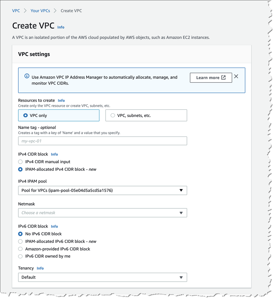 IPAM 풀이 구성되면 새로운 IP 주소 배정이 필요한 개발 팀과 리소스가 자동화된 셀프 서비스 프로세스를 사용하여 개발자의 차단을 해제하고 연결 문제로 이어질 수 있는 수동 프로세스 사용으로 인한 오류를 없앨 수 있습니다. IP 주소 배정을 제어하기 위해 자동화된 간단한 비즈니스 규칙을 사용할 수 있습니다. IPAM의 셀프 서비스 모델을 통해 개발자는 이제 몇 초 만에 리소스를 직접 생성하고 비즈니스 규칙에 따라 IP 주소를 수신하여 애플리케이션 온보딩의 지연을 없애고 개발 팀의 속도를 높일 수 있습니다. 아래 스크린샷에서는 새 VPC를 생성할 때 사용할 주소 범위를 설정하기 위해 풀을 참조하고 있습니다.