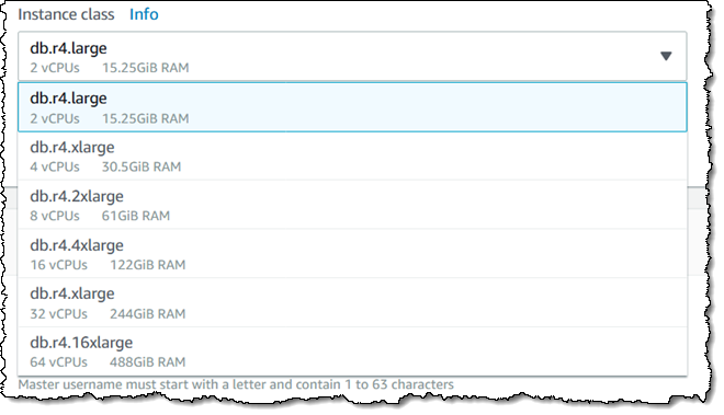 클러스터의 이름을 지정하고 인스턴스 클래스를 선택한 다음 인스턴스의 수를 지정합니다(하나는 기본 인스턴스이고 나머지는 복제본). 그런 다음 마스터 사용자 이름 및 암호를 입력합니다.