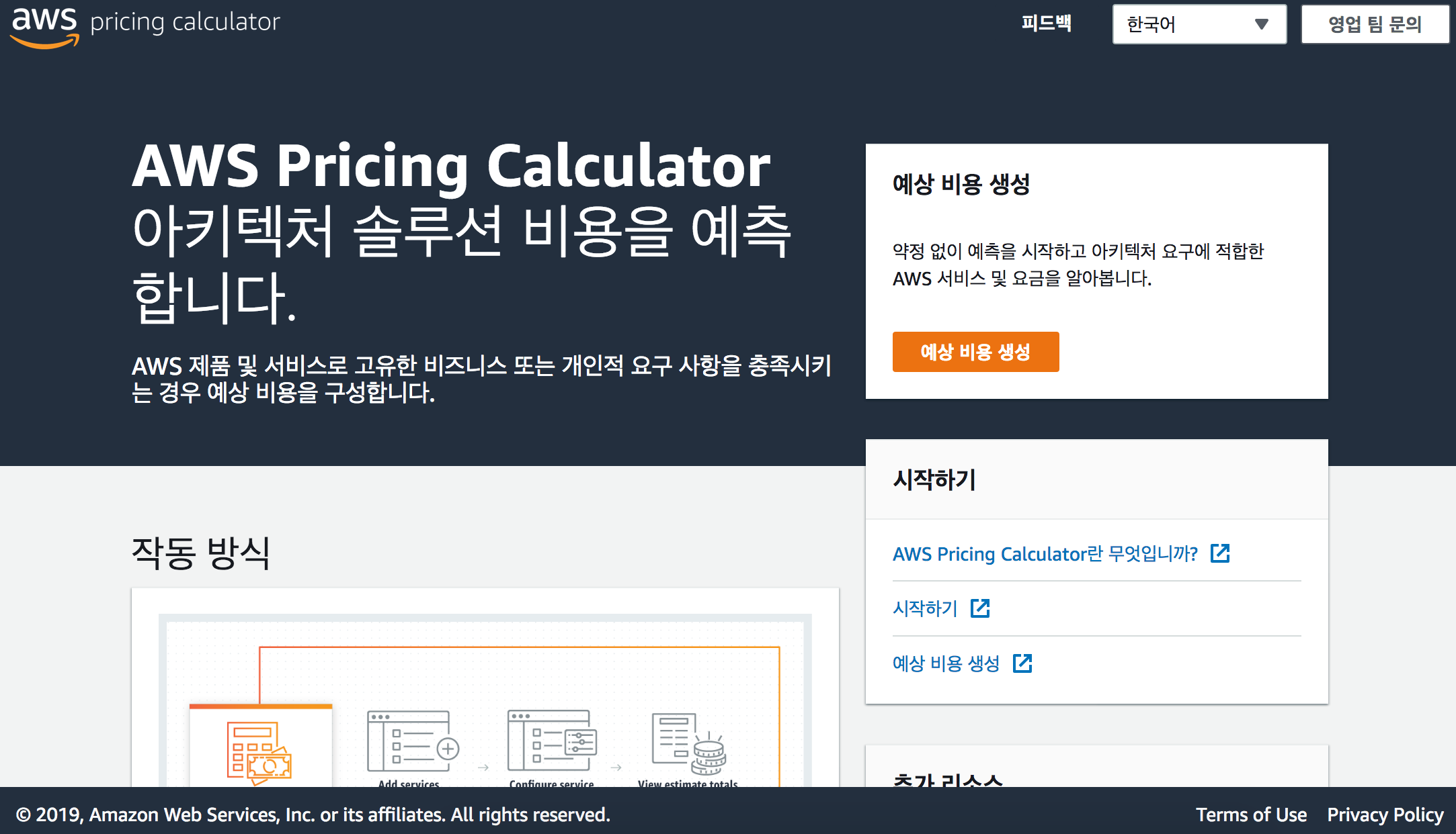 다양한 클라우드 서비스의 각 리전별로 컴퓨팅, 데이터 트래픽 및 스토리지 사용량 등 원하는 자원에 대해 어느 정도 비용이 나오는지 알고 싶은 경우를 위해 AWS에서는 간편 월 비용 계산기를 제공하고 있습니다. (한국어 선택 가능)