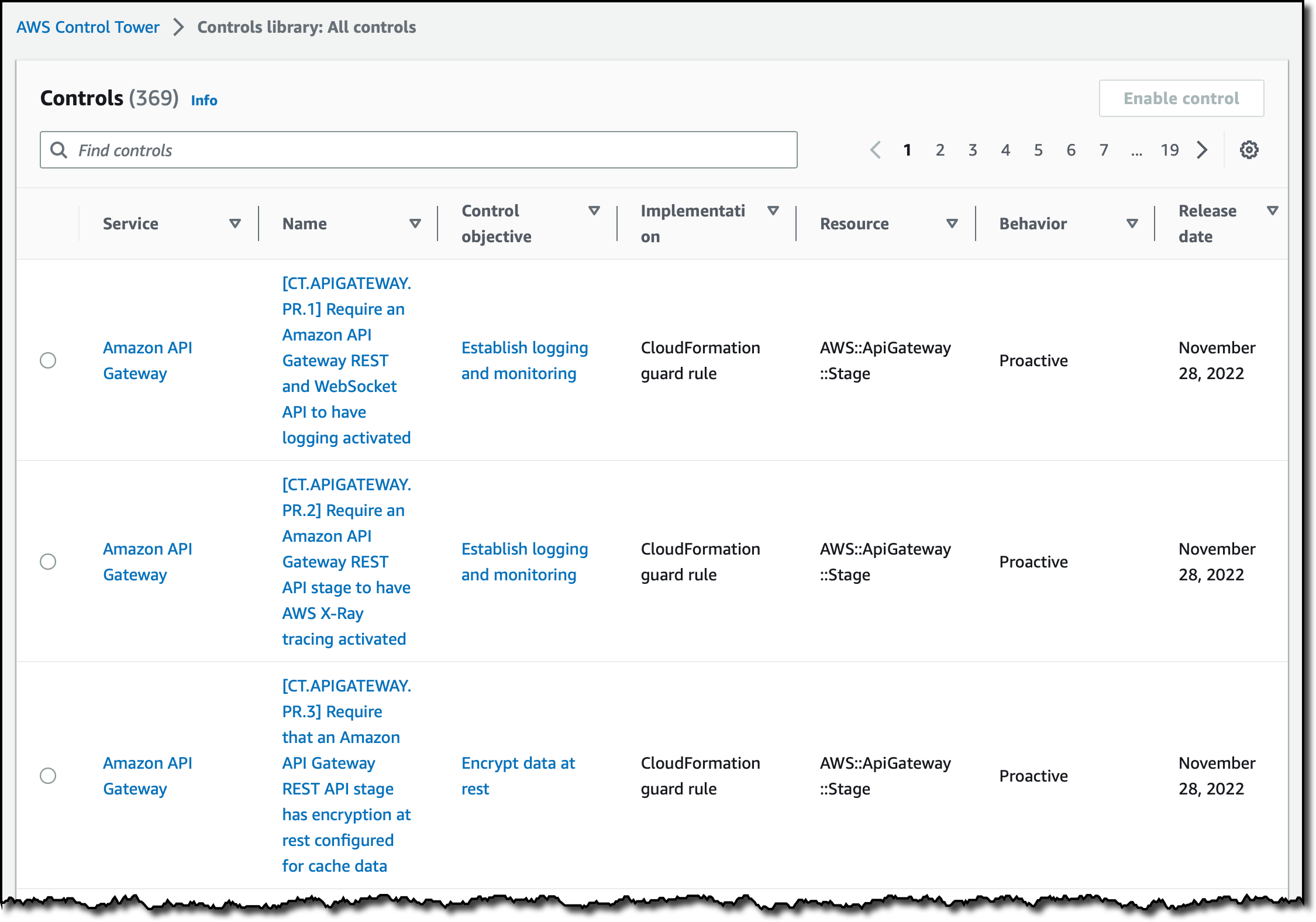AWS Control Tower 콘솔에는 새로운 제어 라이브러리(Controls library) 섹션이 있습니다. 거기서 모든 제어 항목(All controls)을 선택합니다. 현재 300개 이상의 제어를 사용할 수 있습니다. 각 컨트롤에 대해 어떤 AWS 서비스와 관련이 있는지, 이 컨트롤이 속한 제어 목표, 구현 (예: AWS Config 규칙 또는 AWS CloudFormation Guard 규칙), 동작(예방, 탐지 또는 사전 조치), 매핑하는 프레임워크 (예: NIST 800-53 또는 PCI DSS)를 확인합니다.