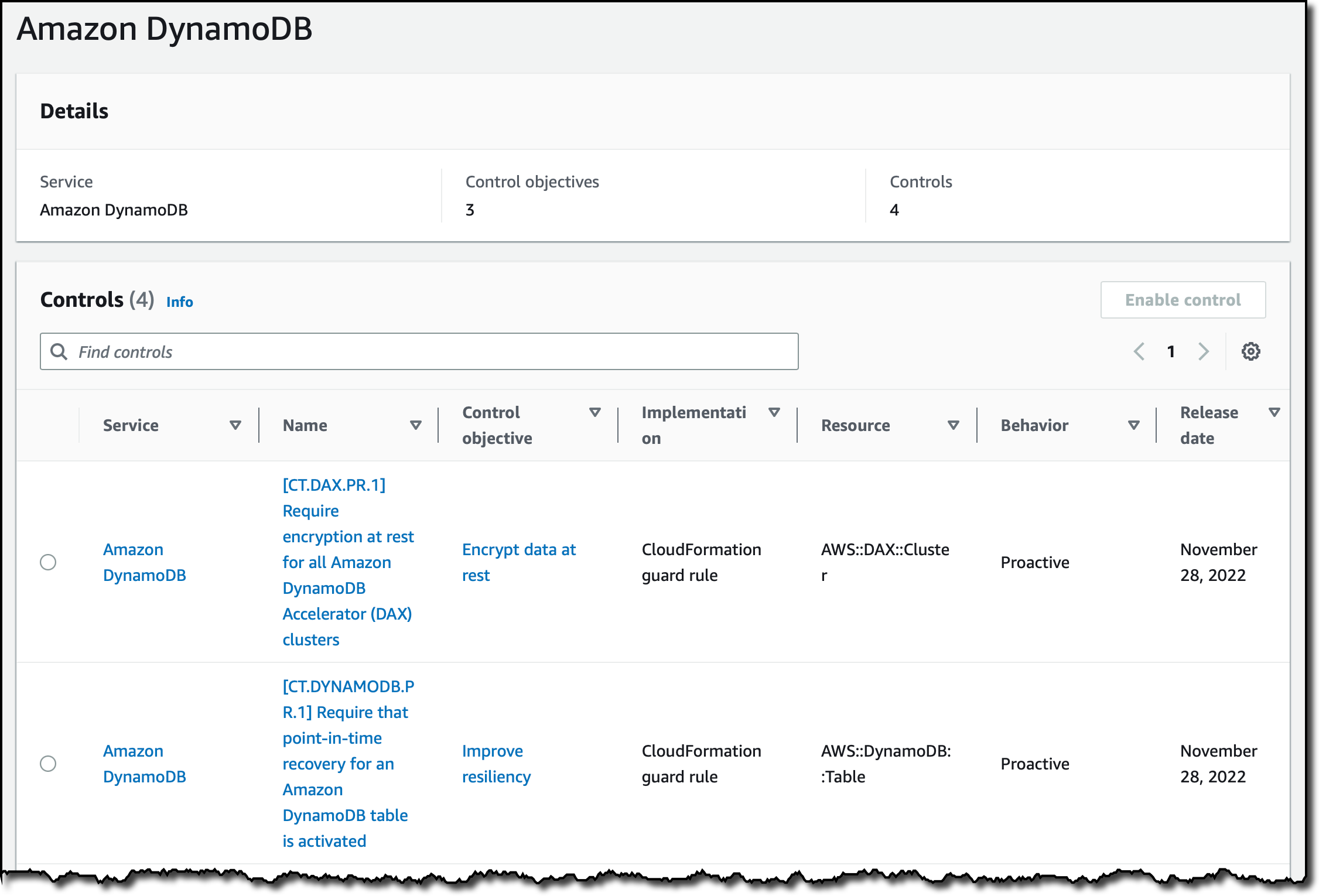 이 서비스에 사용할 수 있는 제어 항목을 보려면 Amazon DynamoDB를 선택합니다.