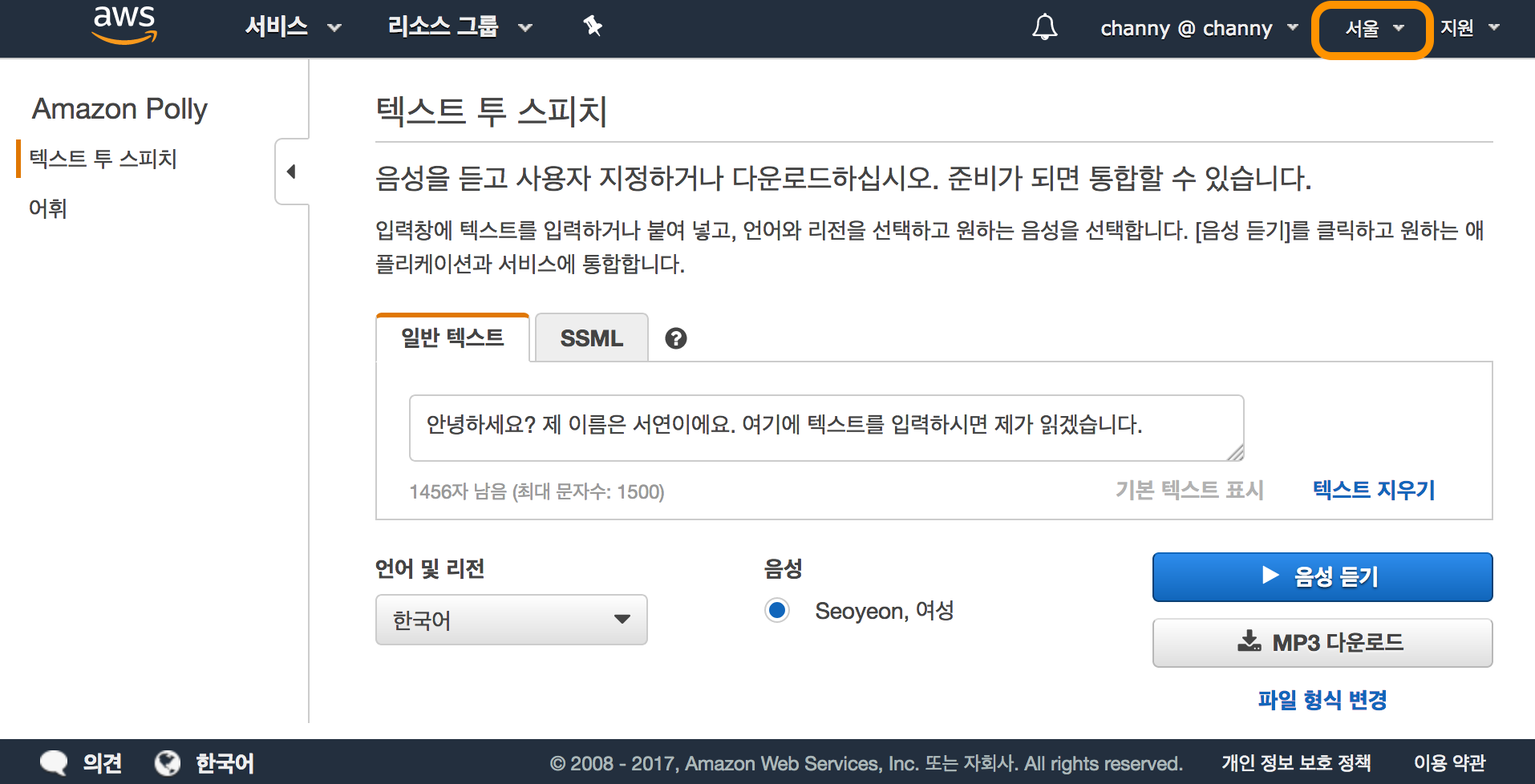 오늘부터 Amazon Polly를 서울 리전에서 사용 가능합니다. 또한, 한국어 여성 ‘서연(Seoyeon)’음성을 공개합니다.