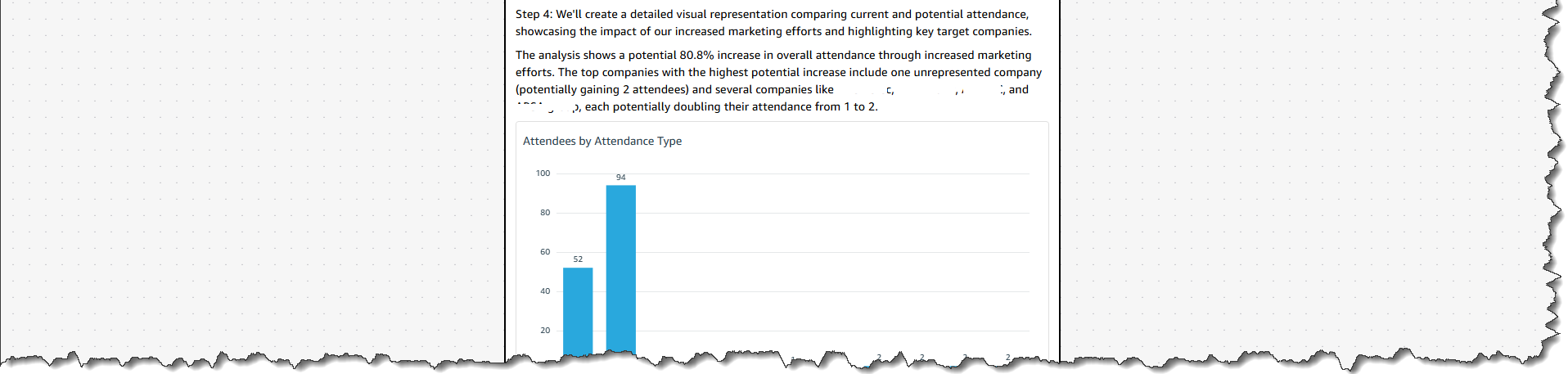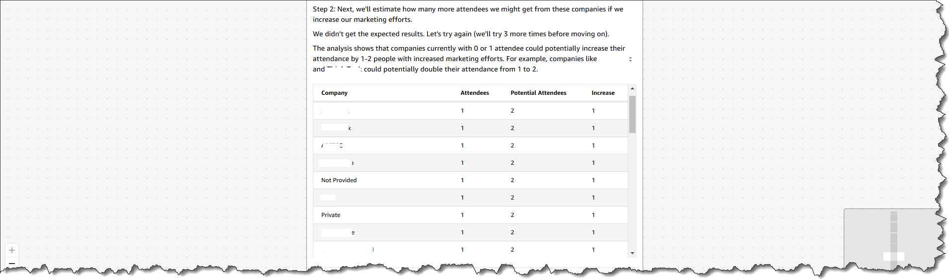 Amazon Q는 필요한 분석을 실행하고 진행 상황을 지속적으로 업데이트합니다. 프로세스의 1단계에서는 참석자가 두 명 미만인 회사를 식별하고 나열합니다.