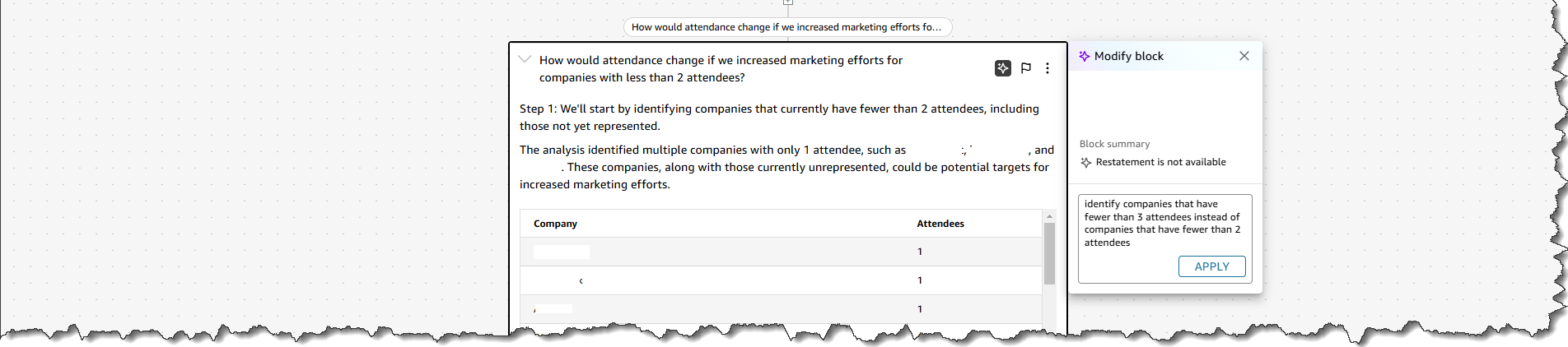 잠재적 참석자 수를 더 늘리기 위해 참석자가 두 명이 아닌 세 명 미만인 회사를 식별하도록 분석을 변경하고 싶었습니다. 오른쪽 상단에 있는 AI 스파클 아이콘을 선택하여 모달을 실행한 후 이 모달을 사용하여 더 많은 컨텍스트를 제공하고 이전 결과를 구체적으로 변경하겠습니다.