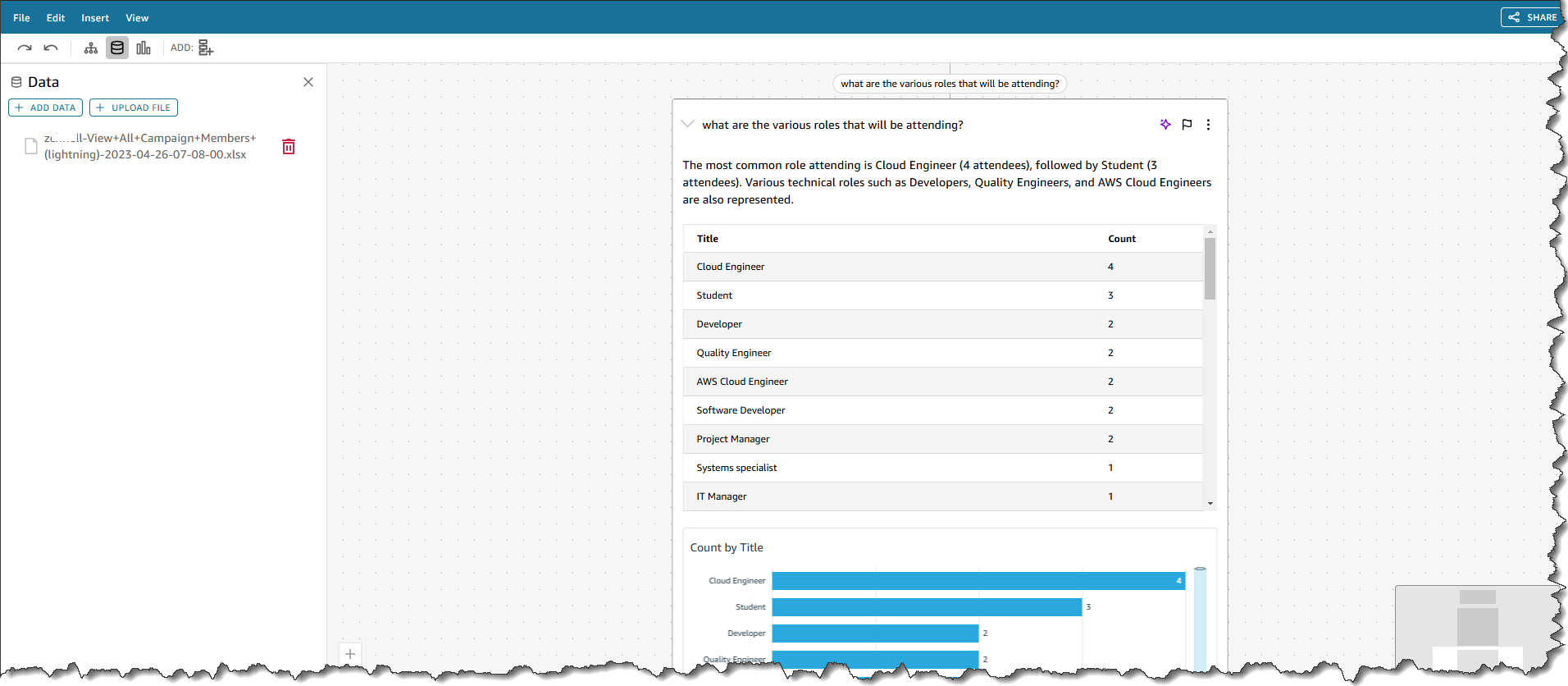 제가 고객 이벤트를 계획하고 있는데 이벤트 참석을 위해 등록한 모든 사람들의 Excel 스프레드시트를 받았습니다. 참석자에 대해 더 알고 싶어서 스프레드시트를 분석하고 몇 가지 질문을 합니다. 먼저 제가 탐색하고 싶은 항목에 대해 설명하겠습니다.