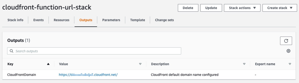 - CloudFormation 템플릿이 배포되면 CloudFormation 스택의 ‘출력‘ 탭으로 이동하여 생성된 기본 CloudFront 도메인 이름에 접근합니다. 접근했을 때 ‘Hello from Lambda!’ 응답이 표시되어야 합니다.