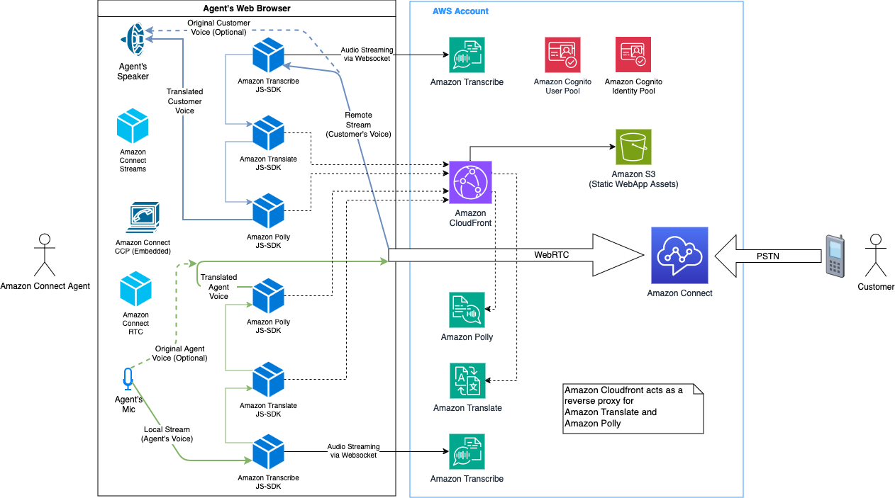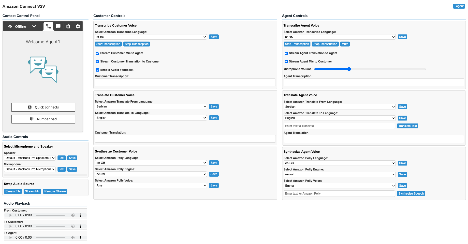 - Seamless integration – The V2V translation sample project integrates with Amazon Connect, enabling agents to handle customer interactions in multiple languages without any additional effort or training, using the Amazon Connect Streams JS and Amazon Connect RTC JS libraries.