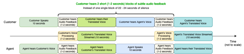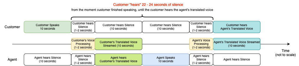 In this scenario, the customer hears a single block of 22–24 seconds of a complete silence, from the moment they finished speaking until they hear the agent’s translated voice. This creates a suboptimal experience, because the customer might not be certain what is happening during these 22–24 seconds—for instance, if the agent was able to hear them, or if there was a technical issue.