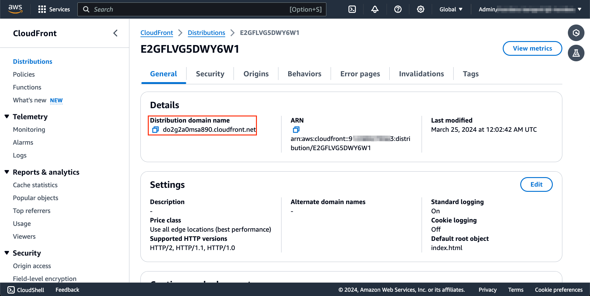 - Access the AWS Networking Costs Calculator in a web browser through the front-end URL. This URL is printed at the end of the AWS CDK deployment process, or you can find it in your account on your CloudFront console, as shown in Figure 3.