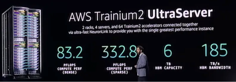 <그림 2. AWS SVP 피터 드산티스(Peter DeSantis)의 키노트에서 소개된 울트라서버 스펙 >