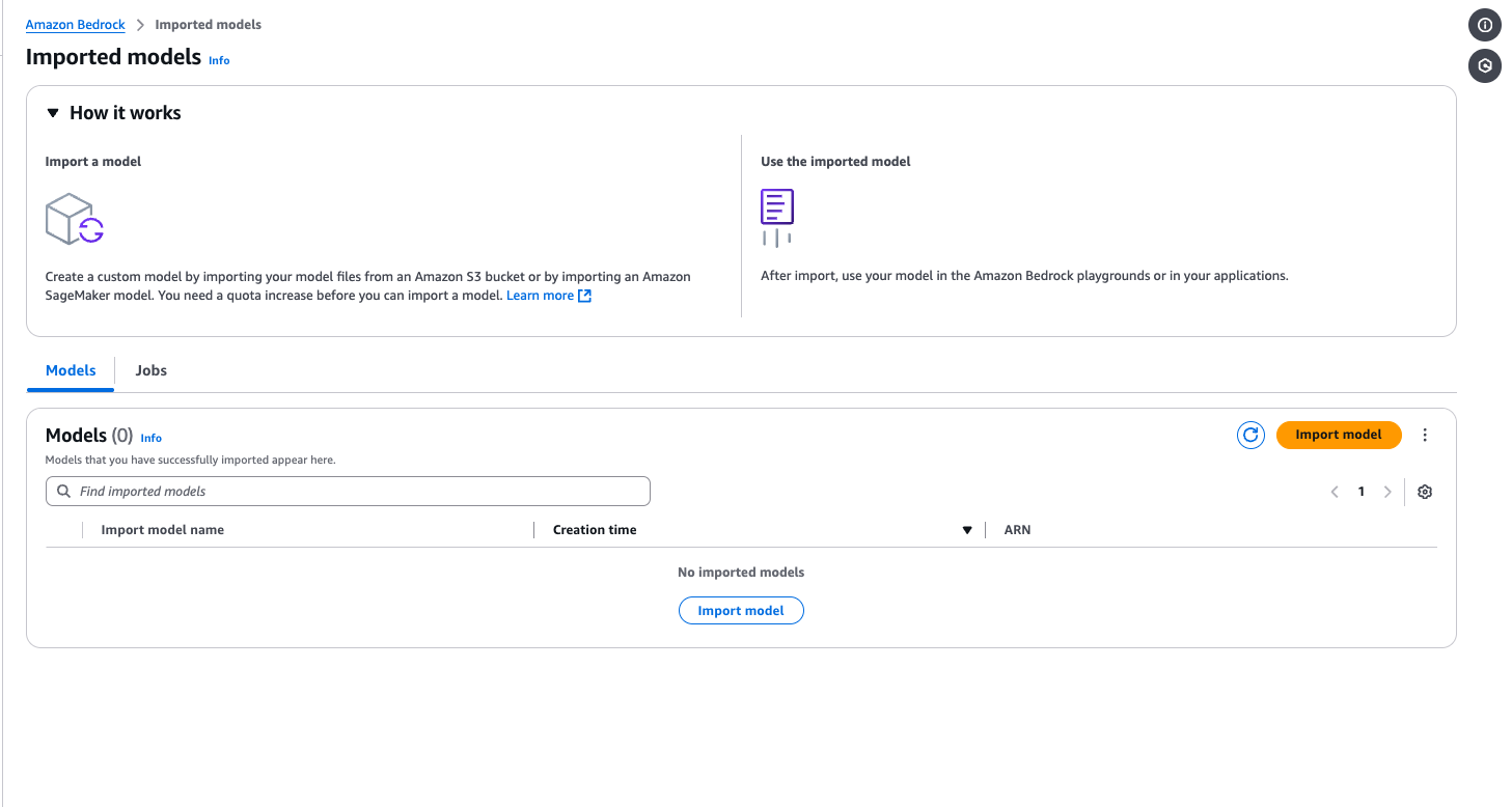 - Amazon Bedrock 콘솔의 탐색 창에서 Foundation Models(파운데이션 모델) 아래에 있는 Imported Models(가져온 모델)을 선택합니다.