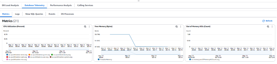 Database Telemetry 뷰를 확인하면 스토리지 관련 CloudWatch 지표를 검토하여 인스턴스에 충분한 여유 스토리지가 있는지 확인할 수 있습니다. CPU 사용률이나 여유 메모리와 같은 다른 지표도 정상 수준으로 보입니다.