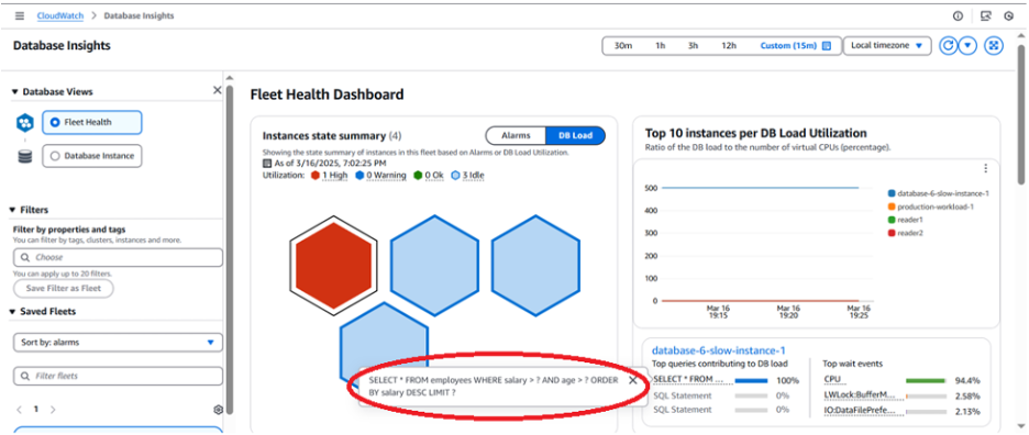 빨간색 육각형을 선택하면 아래와 같이 인스턴스에 대한 추가 정보를 확인할 수 있습니다. 여기에는 DB 인스턴스 이름, DB 부하 사용률 지표, 엔진 버전, 컴퓨팅 구성과 같은 추가 메타데이터가 포함됩니다.