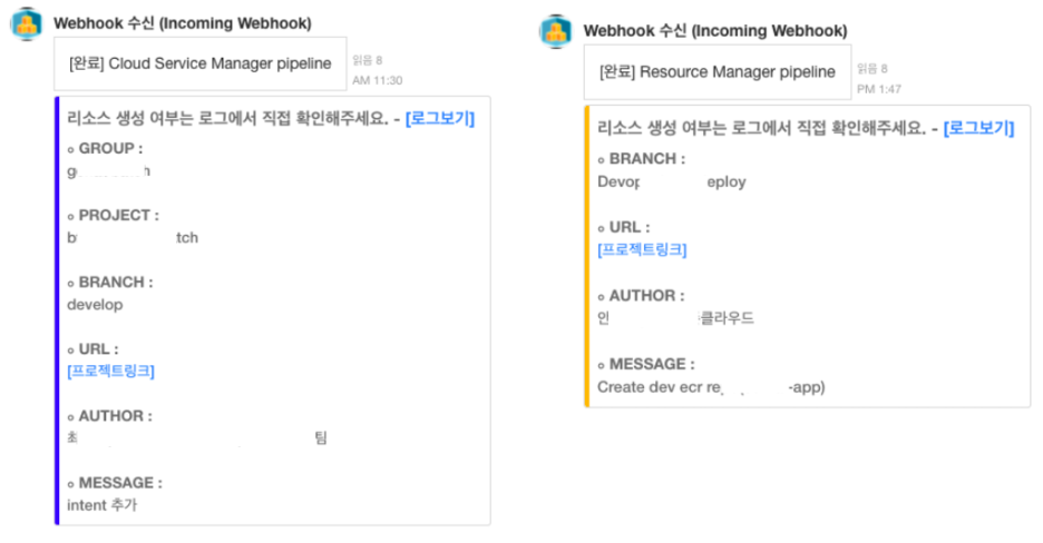 아래 이미지는 사용자/관리자용 파이프라인이 실행된 후의 상황별 알람 메시지입니다