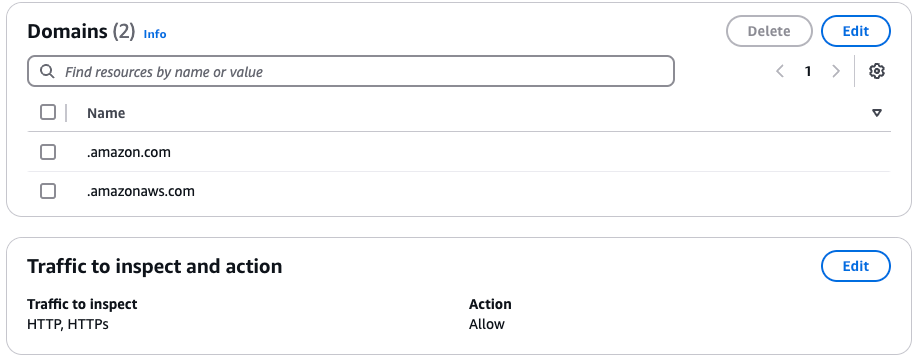 아래 그림은 Domain List 의 허용 규칙 예시입니다. 이 예시는 “.amazon.com”과 “.amazonaws.com” 도메인을 등록하여 이 두 도메인을 포함하는 모든 하위 도메인을 허용하도록 작성한 규칙입니다.