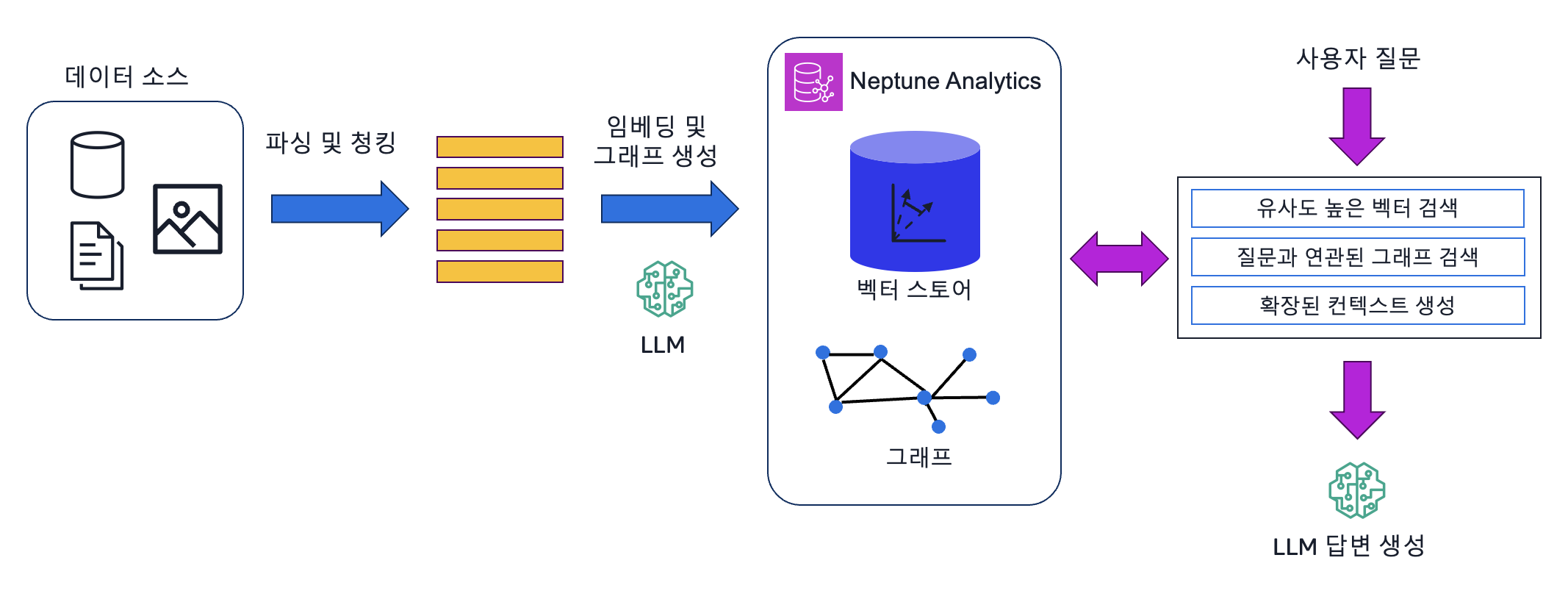 앞서 설명드렸듯이, Bedrock Knowledge Bases에서 GraphRAG를 구현하기 위해 Amazon Neptune Analytics를 벡터 스토어로 활용합니다. Amazon Neptune Analytics는 분석과 메모리 최적화를 위한 그래프 데이터베이스 엔진입니다. 이는 클라우드 네이티브 운영 데이터베이스 서비스인 Amazon Neptune Database를 보완하는 서비스로, GraphRAG의 벡터 스토어로서 대규모 데이터 셋에 대한 높은 수준의 이해가 필요한 쿼리에 이상적입니다.