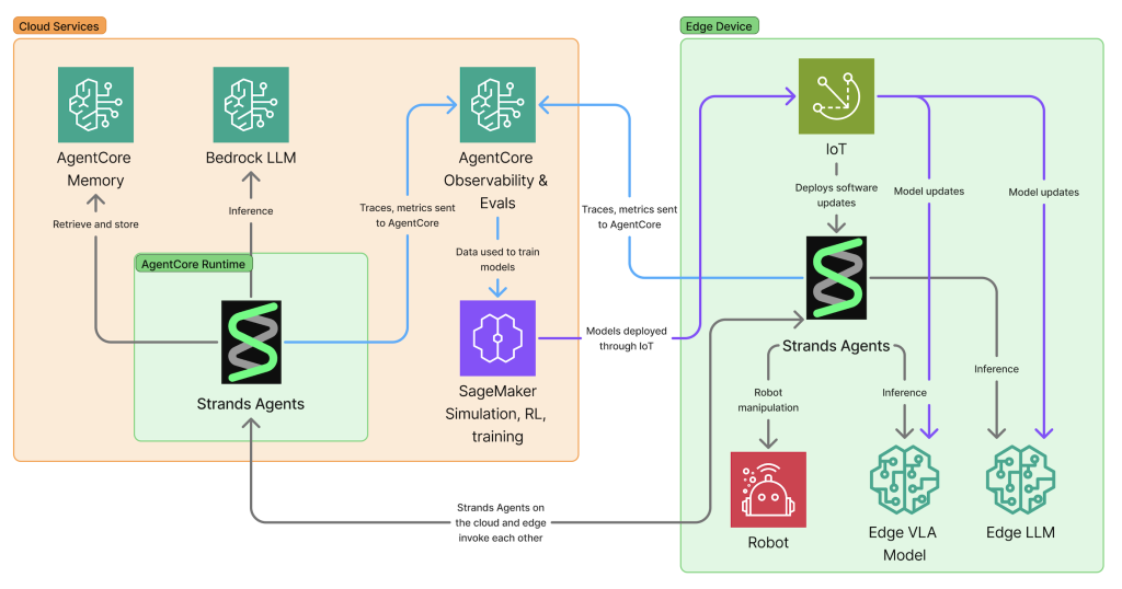 클라우드는 엣지에서는 실현하기 어려운 추가적인 역량을 제공합니다. AgentCore Memory는 수 시간 또는 수일에 걸친 공간적·시간적 맥락을 유지하며, 단순히 무슨 일이 일어났는지뿐만 아니라 어디서, 언제 발생했는지까지 기억할 수 있습니다. 학습 결과를 개별 디바이스에 한정하지 않고 전체 플릿에 걸쳐 수집하고 적용할 수 있습니다. 한 로봇이 더 나은 방법을 발견하면, 그 지식은 공유 메모리를 통해 모든 로봇에 제공됩니다. 전체 플릿에 대한 분산 관측성은 AI 에이전트와 로봇이 대규모로 배포되었을 때 무엇을 하고 있는지 파악할 수 있는 능력을 제공하며, 단일 디바이스로는 얻을 수 없는 인사이트를 도출합니다. Amazon SageMaker는 대규모 병렬 시뮬레이션과 모델 학습을 지원하여, 실제 환경 및 시뮬레이션 배포에서 얻은 학습 결과를 개선된 모델에 반영하고 이를 전체 플릿에 적용할 수 있게 합니다.