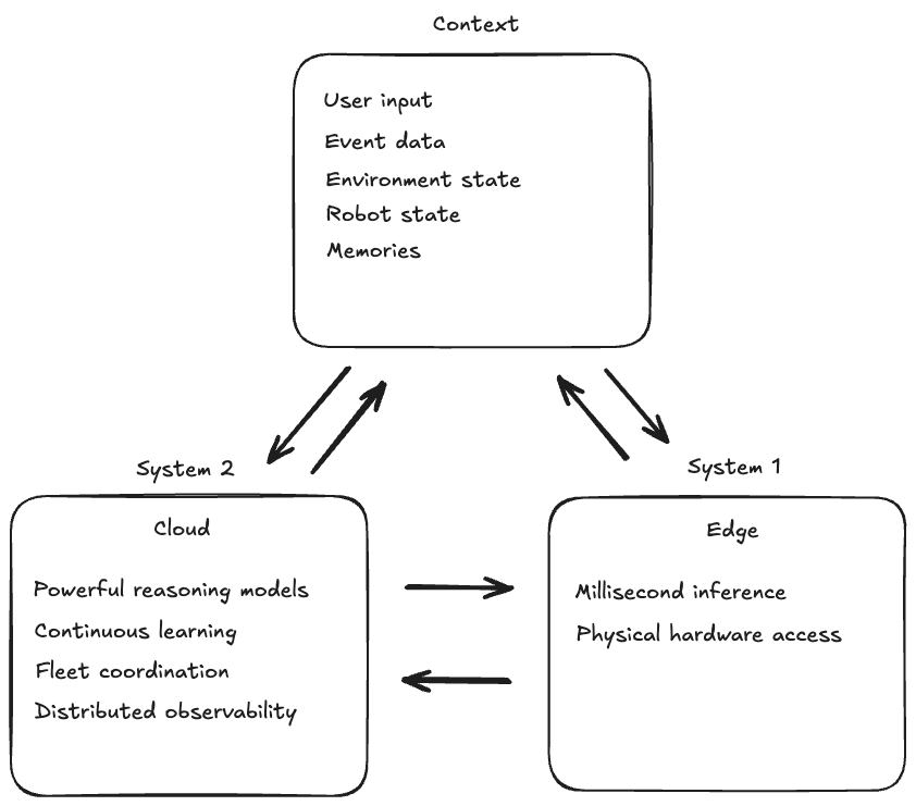 이는 Daniel Kahneman의 시스템 1과 시스템 2 사고를 반영합니다 – 엣지는 빠르고 본능적인 반응을 제공하고, 클라우드는 신중한 추론, 장기 계획, 지속적 학습을 가능하게 합니다. 가장 뛰어난 Physical AI 시스템은 이 두 가지를 매끄럽게 결합하여 활용합니다.