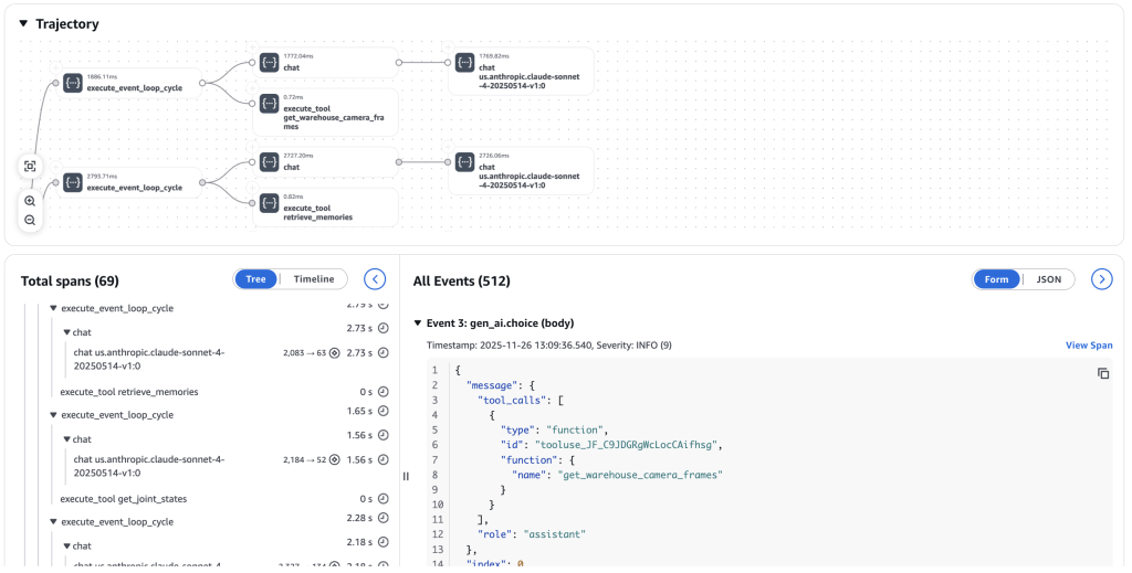 AgentCore Observability는 추론 → 시뮬레이션/행동 → 관찰 → 평가 → 최적화로 이어지는 완전한 피드백 루프를 통해 지속적 개선의 기반을 제공합니다. CloudWatch의 GenAI Observability 대시보드는 엣지 디바이스로부터 엔드투엔드 트레이스를 수집하여, 에이전트 실행 경로, 메모리 검색 작업, 전체 시스템의 지연 시간 분석을 보여줍니다. 이 관측성 데이터는 강화 학습의 학습 신호로 활용되어, 성공적인 행동은 강화하고 실패는 교정에 반영됩니다.