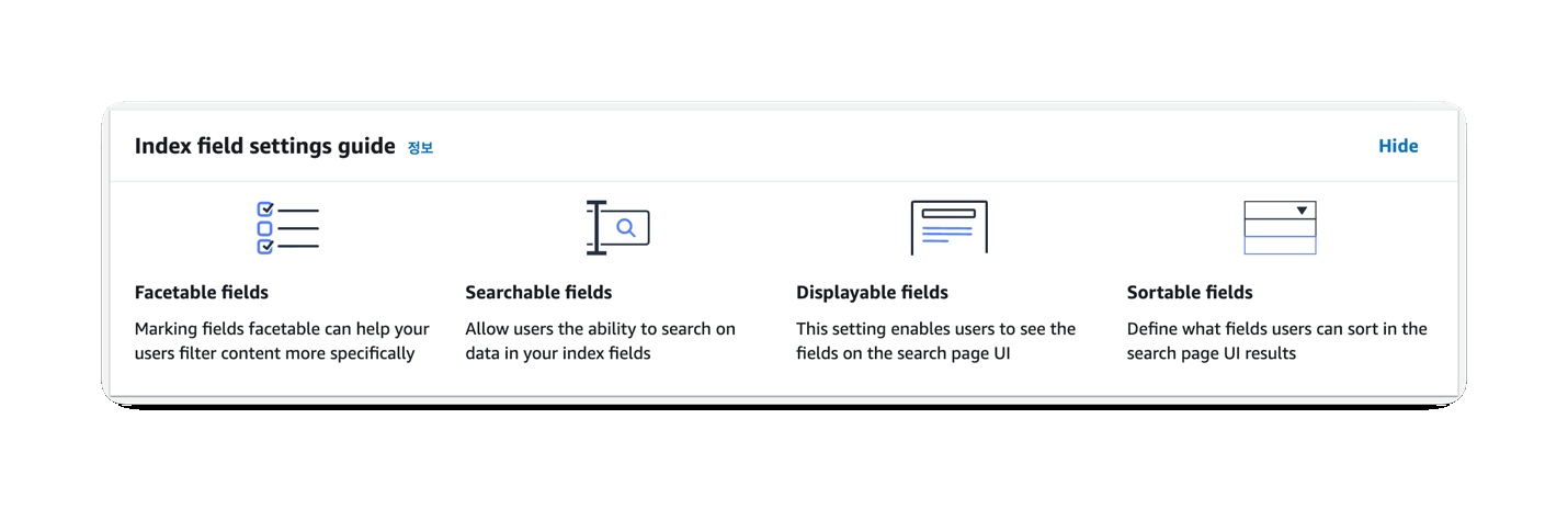 해당 기능은 문서 객체에 대하여 [카테고리], [태그], [요약 정보], [뷰 카운트]등과 같은 메타데이터를 아래와 같이 JSON 파일을 만들어 <document>.<extension>.metadata.json 와 같은 형식으로 파일명을 지정하여 문서 객체와 동일한 경로에 저장하게 되면 Amazon Kendra가 데이터 소스에 대한 크롤링 시에 해당 정보를 검색 결과에 반영합니다. 또한, 아래와 같이 메타데이터에 대한 필드를 인덱스에 추가하여 필드에 대한 [Facetable], [Searchable], [Displayable], [Sortable] 설정을 할 수 있습니다.