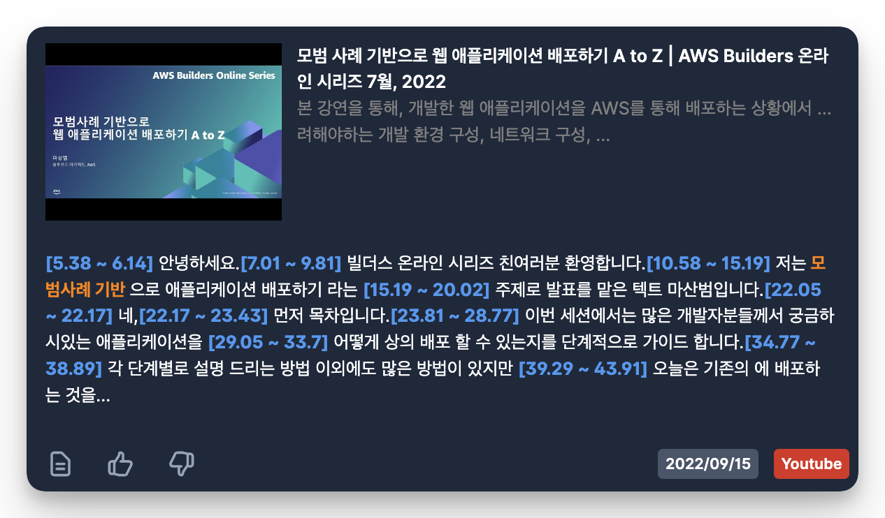 다음 블로그 포스팅에서는 AWS AI 및 서버리스 서비스들을 이용하여 콘텐츠를 텍스트화하여 Amazon Kendra를 통해 검색할 수 있도록 하는 방법을 가이드할 예정입니다.