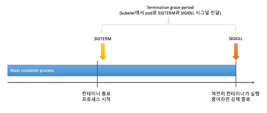 kubelet은 Pod 내 컨테이너들에서 실행되는 애플리케이션을 종료하기 위해 SIGTERM 시그널을 보냅니다. 하나의 Pod 안에는 여러 개의 컨테이너가 실행될 수 있는데 각 컨테이너의 PID 1번 프로세스에게 SIGTERM 명령을 실행하는 것입니다. SIGTERM 시그널의 특징은 애플리케이션이 종료 로직을 실행할 수 있도록 일정 시간동안 기다려 준다는 것입니다.