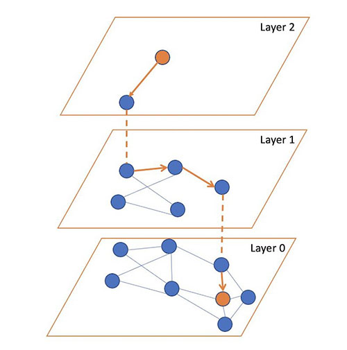 검색 중에는 최상위 계층의 임의의 벡터에서 시작하여 그래프를 부분적으로 탐색하여 해당 계층에서 쿼리 벡터에 가장 가까운 지점을 찾은 다음 바로 아래 계층의 벡터를 탐색의 시작점으로 사용합니다. 최하위 계층에 도달할 때까지 이 과정을 반복합니다. 맨 아래 계층에서는 순회를 수행하지만 이번에는 가장 가까운 이웃을 검색하는 대신 도중에 방문한 k-nearest neighbors를 추적합니다.