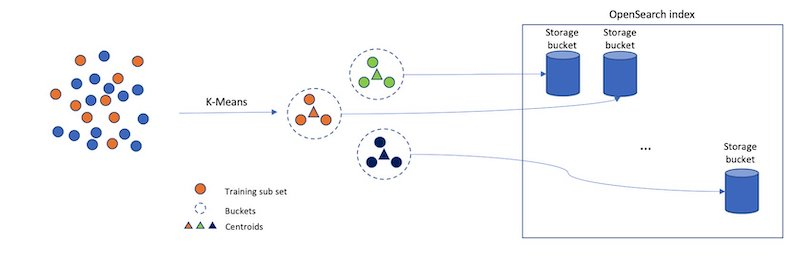 인덱스 벡터를 버킷 집합으로 분리한 다음, 검색 시간을 줄이기 위해 이러한 버킷의 하위 집합만 검색하는 다른 접근 방식을 고려해 볼수 있습니다. 높은 수준에서 보면, 이것이 바로 Inverted File System(IVF) ANN 알고리즘이 하는 일입니다. OpenSearch 1.2에서는 k-NN 플러그인에 Faiss의 IVF 구현을 위한 지원이 도입되었습니다. Faiss는 고밀도 벡터의 효율적인 유사도 검색과 클러스터링을 위한 Meta의 오픈 소스 라이브러리입니다.