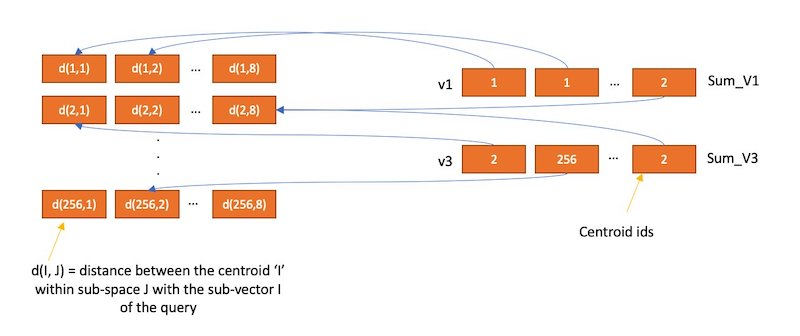 모든 테이블이 생성되면 각 하위 벡터를 파티션의 테이블에서 가장 가까운 벡터의 ID 로 대체하여 벡터를 인코딩합니다. code_size = 8인 예제에서는 테이블에 28개의 요소가 있기 때문에 ID를 저장하는 데 8비트만 필요합니다. 따라서 dimension = 1024, m = 8을 사용하면 하나의 벡터의 총 크기(32비트 부동 소수점 데이터 유형을 사용한다고 가정)가 4,096바이트에서 약 8바이트로 줄어듭니다!