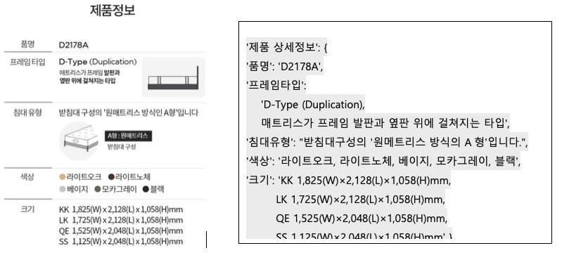다음은 상품 기술서에서 추출된 제품 상세 정보 예시 입니다.