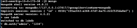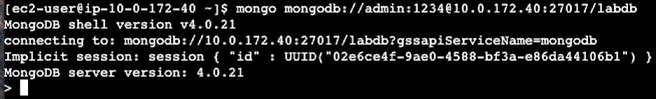 아래와 같이 입력하여 labdb에 접속되는 것을 확인합니다. mongo mongodb://admin:1234@<EC2 private IP>:27017/labdb