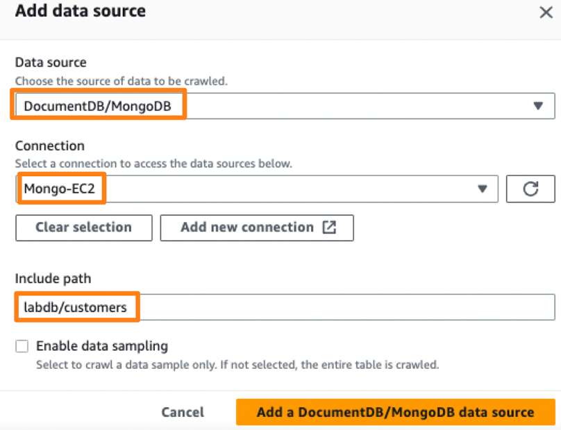 이번 단계에서는 MongoDB를 위한 Data Source를 Amazon Athena에서 생성합니다.