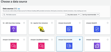 [Amazon Athena Console -> Data sources -> Create data source]에서 데이터소스를 생성합니다. Amazon Athena에서 연결할 수 있는 데이터소스로 30개 이상을 제공하고 있습니다. 여기서는 MongoDB에 연결하기 위해 ‘Amazon DocumentDB’를 선택하고 ‘Next’를 클릭합니다.