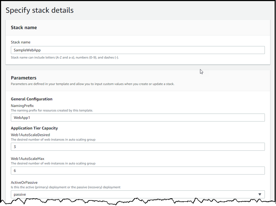 ActiveOrPassive 값을 변경할 수 있습니다. 다음 명령은, 현재 EC2 인스턴스가 없는 EC2 Auto Scaling 그룹에 3개( Web1AutoScaleDesired의 값)의 인스턴스를 추가하도록 업데이트합니다. 새로운 템플릿을 사용하지 않고 기존 스택의 파라미터 값만 active로 업데이트를 합니다.