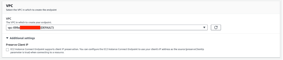 EIC Endpoint를 생성할 VPC 를 선택하고 앞에 설명한 클라이언트 IP 보존이 필요한 경우 Preserve Client IP 를 선택합니다.