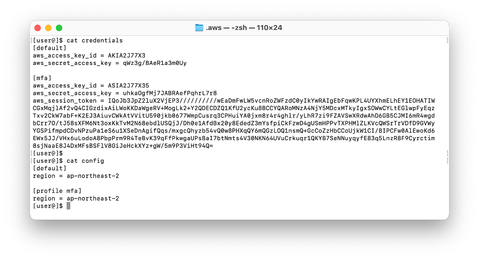 이렇게 생성된 임시 자격 증명을 이용하여 새 프로파일 구성을 추가 합니다. 새 프로파일을 만들지 않는경우 default 프로파일 정보가 사라지기 때문에 임시 자격 증명을 얻기 위해 새로 access_key를 생성해야 할 수 있으므로 새로운 프로파일을 생성하는 것을 권장합니다.