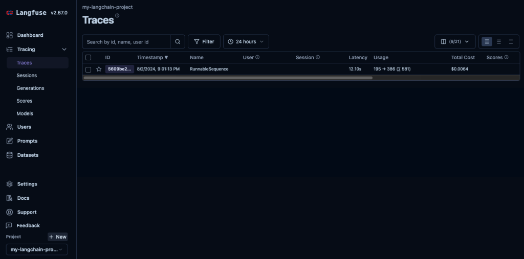 이제 LLM 애플리케이션 코드를 실행하면 Langfuse 웹 콘솔에서 생성된 트레이스를 확인할 수 있습니다.