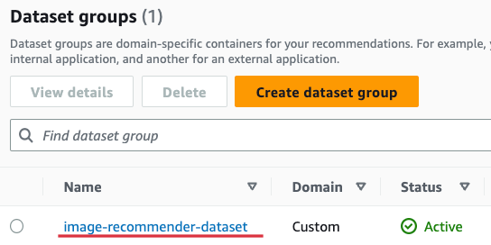 Personalize에서 User와 Interaction 데이터를 수집하기 위해서는 Event Tracker를 생성하여야 합니다. Data Group Console로 진입하여, 아래와 같이 “image-recommender-dataset”을 선택합니다. 이후 [Create event tracker]를 선택합니다.