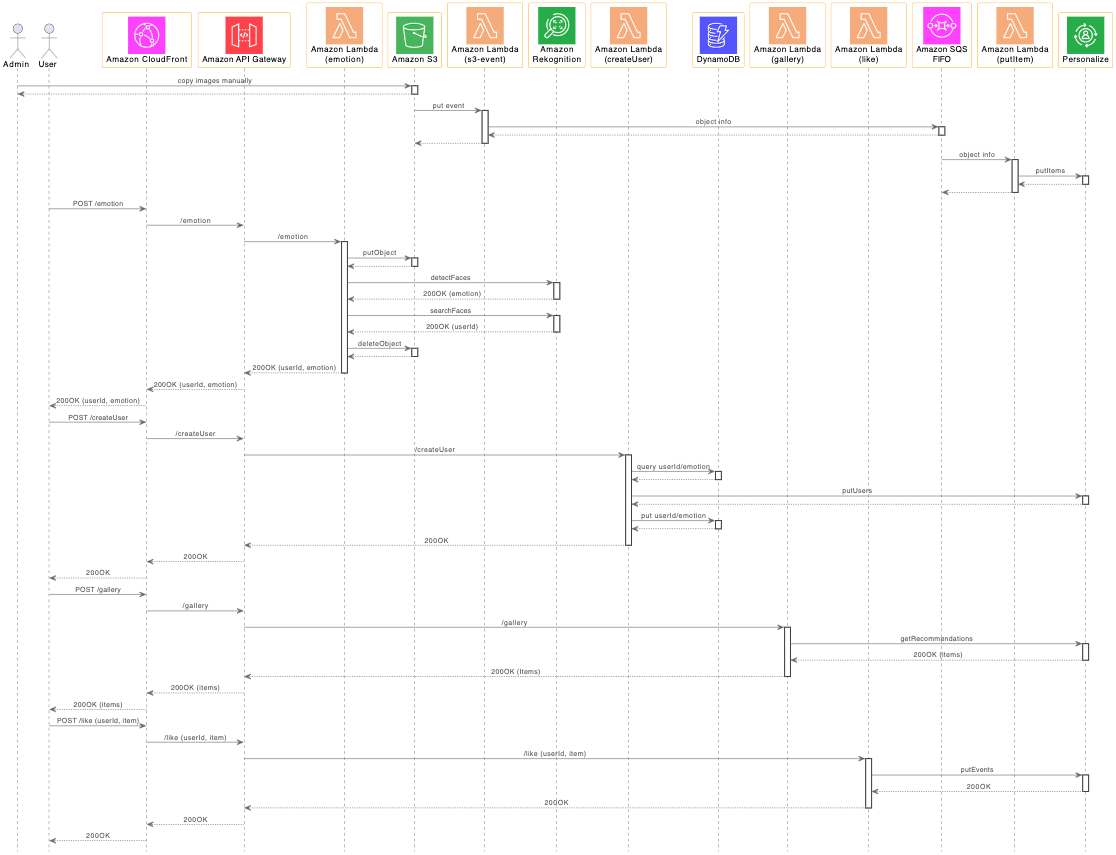 이미지를 생성할 때에 SageMaker JumpStart에서 제공하는 Stable Diffusion 모델의 Endpoint를 이용하는데 GPU를 가진 EC2를 이용하므로 다수의 이미지를 일정 시간동안 빠르게 생성한 다음에 중지시키는 것이 비용 효율적입니다. 이를 위해서 Event driven 방식으로 FIFO 형태의 Amazon SQS를 사용하여 이미지를 생성하며, 생성된 이미지는 상용 폴더가 아닌 이미지풀(image pool)에 우선 저장합니다. 시스템 관리자는 이미지풀에 저장된 이미지가 적절하게 감정을 표현했는지 확인하고, 상용 폴더로 복사합니다. 상용 폴더에 다수의 이미지가 한꺼번에 들어올 수 있으므로 FIFO 형태의 SQS와 Amazon Lambda를 통해 순차적으로 아이템 데이터셋에 저장합니다. 이후 사용자가 카메라를 이용해 화면을 캡처하면, Amazon CloudFront / API Gateway를 통해 이미지가 인입되고 Lambda를 통해 Rekognition에서 이미지를 분석합니다. 이후 사용자가 감정에 따른 이미지 추천을 요청하면 Lambda를 통해 Personalize에 추천 추론(inference)을 요청합니다. 추천 추론의 결과는 이미지 리스트로서 웹페이지에 전달되어 보여집니다. 사용자는 자신의 감정에 맞는 이미지를 선택하여 선호(like)를 표시할 수 있으며, 이때 생성된 상호작용(interaction) 이벤트를 상호작용 데이터셋으로 저장하여 추천 추론(inferece)을 향상시키는 데에 활용합니다.