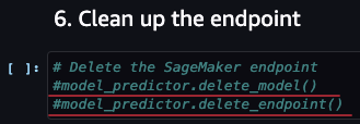 - 노트북의 마지막으로 이동하여 아래와 같이 “model_predictor.delete_model()”와 “model_predictor.delete_endpoint()”을 주석처리 합니다.