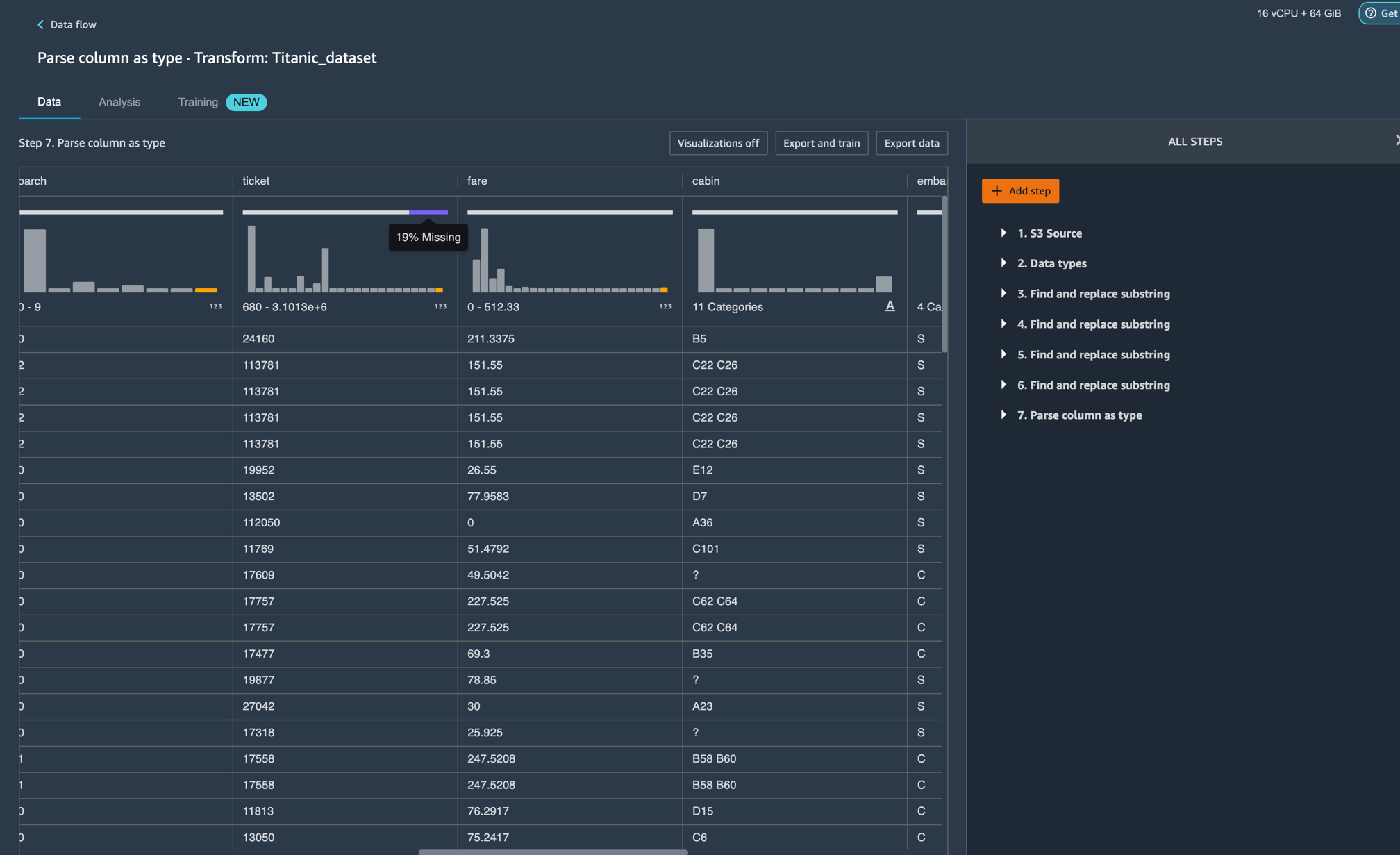 Amazon SageMaker Studio 환경설정을 시작하고 새로운 Data Wrangler flow를 생성합니다. 자신의 데이터 세트를 가져오거나 다음 이미지와 같이 샘플 데이터 세트(Titanic)를 사용할 수 있습니다. 이 두 노드(Source 노드 및 Data Type 노드)는 클릭할 수 있는데, 이 두 노드를 두 번 클릭하면 Data Wrangler가 테이블을 표시합니다.