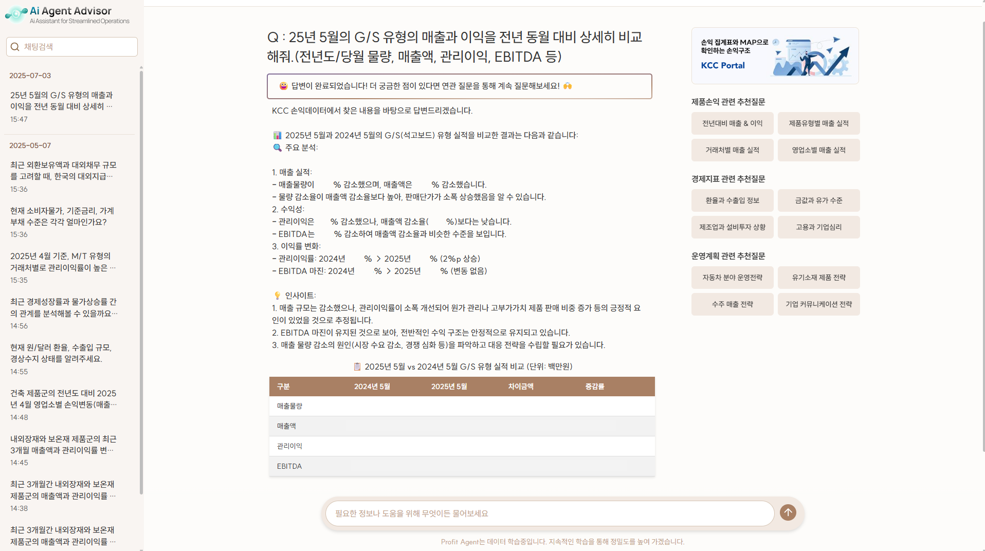 KCC의 월별 손익 데이터를 기반으로 매출, 비용, 이익 등을 분석하며, 전년동기 비교, 시계열 분석, 권한 기반 데이터 응답, 경제 지표 연계 분석 등을 통해 경영 인사이트를 도출하는 역할을 수행합니다. Narrative 응답 외에도 Action 중심의 구조로 고도화되어 연관 질문 생성, 외부 지표 기반 추천, 차트/리포트 자동 생성까지 가능합니다.