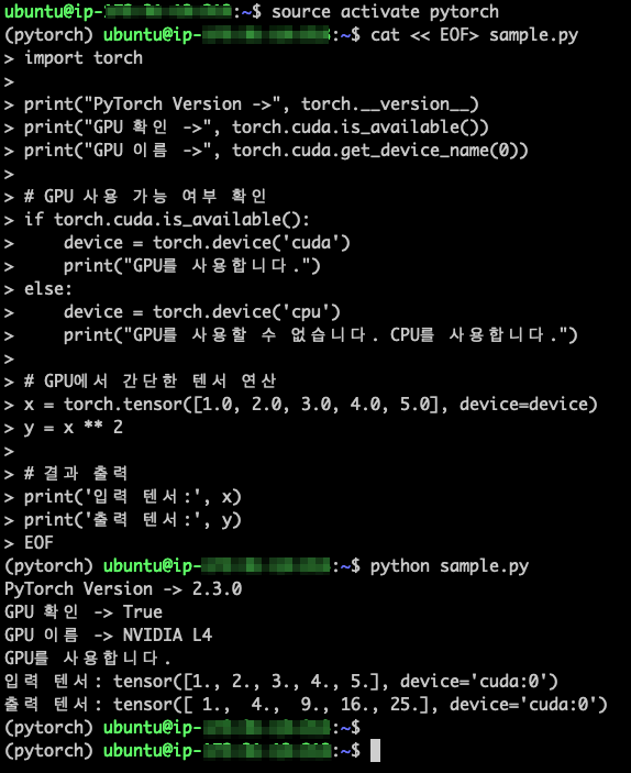이제 G6 인스턴스의 GPU를 테스트할 수 있는 환경의 준비가 완료 되었습니다. 먼저 PyTorch 파이썬 가상 환경을 활성화하고, 아래의 샘플 스크립트를 실행하여 결과를 확인합니다. Conda 환경을 처음 시작할 때 로드가 되는 동안 기다려야 합니다. Conda를 사용한 DLAMI는 프레임워크가 처음 활성화될 때 EC2 인스턴스에 가장 최적화된 버전의 프레임워크를 자동으로 설치합니다. 한번 활성화가 된 이후에는 지연이 발생하지 않습니다.