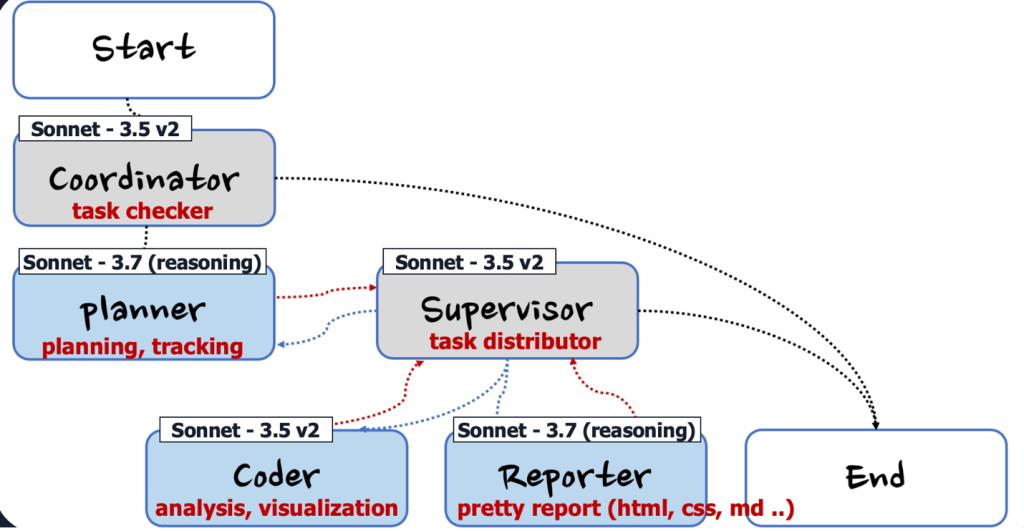 중요한 점은 각 에이전트가 작업을 완료할 때마다 Planner가 다시 호출되어 Task Tracking을 수행한다는 것입니다. 이를 통해 계획된 분석이 올바르게 수행되었는지 확인하고, 필요시 추가 분석이나 수정 작업을 지시합니다. 예를 들어, Coder가 데이터 분석을 완료하면 Planner가 결과를 검토하여 계획한 분석이 모두 수행되었는지, 예상치 못한 데이터 패턴이 발견되어 추가 분석이 필요한지 등을 판단합니다.