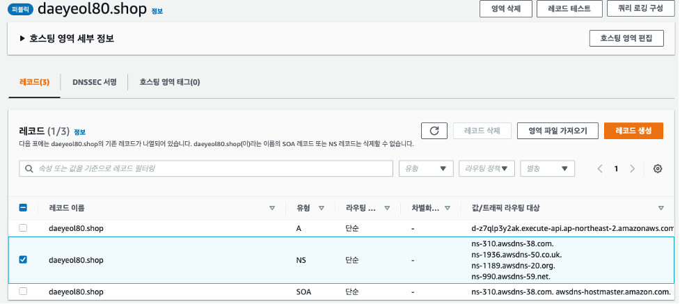 - 도메인으로 입력 시(daeyeol80.shop) Amazon API Gateway에 설정된 사용자 지정 도메인 이름으로 라우팅이 되도록 레코드를 추가합니다.